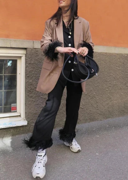 - Decorated with feather on sleeves and pants