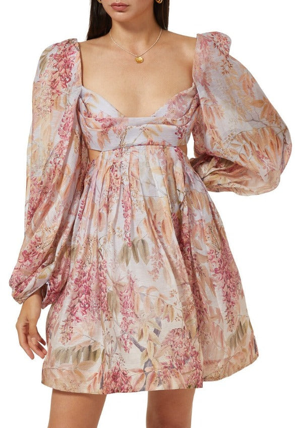 The MONTTERINI BRALETTE MINI DRESS in Milettia Floral from Spring 2021 Collection. A silk linen organza mini dress featuring a pleated bodice, side waist cut-outs and blouson sleeves with invisible zips in the cuffs.